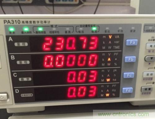 首先,可以從第一張圖中看到,PA310的“最大保持”指示燈亮著,此時(shí)打開了最大保持功能,也就是說儀器上顯示的數(shù)據(jù)是最大值,而不是實(shí)時(shí)數(shù)據(jù)。其次在第二排電流顯示窗口,沒有看到電流值,而在第三排功率顯示窗口中卻有功率數(shù)據(jù),由此可知電流量程選擇太大,這樣會(huì)給測量帶入更大的量程誤差。