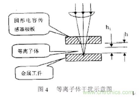 在工件尚未被切穿的瞬間,激光和金屬相互作用,在噴嘴和加工對象之間產(chǎn)生云霧狀等離子體,改變電容極板之間的介質(zhì),從而對電容傳感器產(chǎn)生干擾。在正常切割過 程中,輔助氣體將等離子體從切縫中吹散,對電容傳感器產(chǎn)生影響較小。但假如加工速度太快和剛開始切割時,由于工件未被完全切穿,激光照射點(diǎn)四周會產(chǎn)生等離 子體云,對電容傳感器產(chǎn)生干擾,嚴(yán)重時甚至使傳感器無法正常工作,嚴(yán)重影響加工質(zhì)量。圖4為等離子體干擾示意圖。