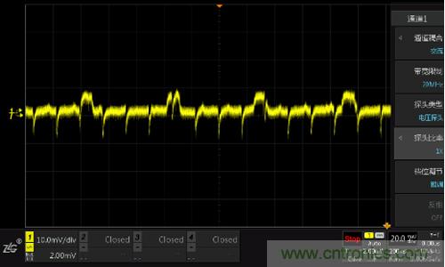 從圖5中可以看出,正確的紋波測量方式可以清晰的捕抓到正常的紋波,減少了不必要的噪聲和雜波對紋波的影響,基本上就是一條干凈的紋波了,在這樣的基礎(chǔ)上進行電源紋波測量,可以更精確的測量紋波的值,進而準確估測電源質(zhì)量。