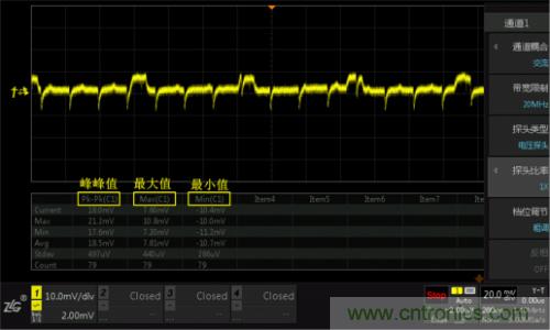 紋波測試一般以峰峰值來表示,具體可以使用【measure】進行自動測量,如下截圖ZDS2000系列示波器,能支持51種真正意義的參數(shù)測量統(tǒng)計功能,基于全存儲深度的基礎(chǔ)上測量紋波的參數(shù),或者也可以使用“一鍵光標”進行手動測量,如下圖6所示。