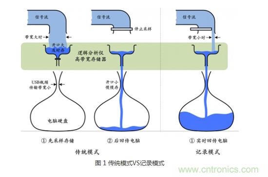 圖 1形象的詮釋了傳統(tǒng)模式和記錄模式的區(qū)別;當(dāng)信號(hào)流很大時(shí),直接存到細(xì)口瓶肯定溢出,只能先存到寬口瓶,存滿后先停下來,再慢慢傳回細(xì)口瓶;當(dāng)信號(hào)流不大時(shí),寬口瓶充當(dāng)傳輸管,將信號(hào)流直接引入細(xì)口瓶,可長(zhǎng)時(shí)間不間斷存儲(chǔ)。
