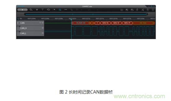 記錄模式非常適用于低速串行協(xié)議分析,如CAN、LIN、FlexRay、SPI、IIC、UART等。不間斷長(zhǎng)時(shí)間的記錄,確保了數(shù)據(jù)幀的完整性,排查偶發(fā)異常故障非常有用。