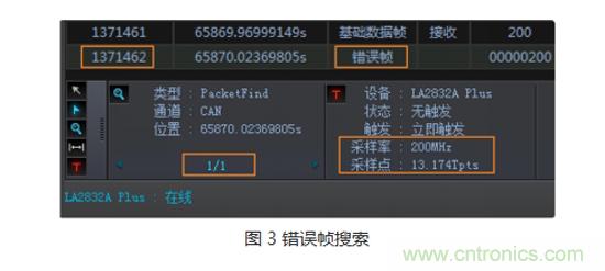 這個(gè)大可放心,通過強(qiáng)大的搜索或過濾功能,進(jìn)行“錯(cuò)誤幀”定位。不用幾十秒,就完成了100多萬幀數(shù)據(jù)的排查,并發(fā)現(xiàn)定位一個(gè)錯(cuò)誤幀(1371462幀),如圖 3所示。