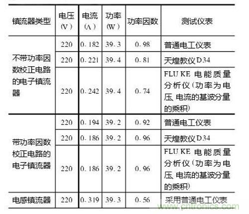 筆者用不同的儀器對(duì)不同品牌40W電子鎮(zhèn)流器啟動(dòng)的熒光燈和電感鎮(zhèn)流器啟動(dòng)的熒光燈做了實(shí)驗(yàn),其測(cè)得的數(shù)據(jù)如下表: