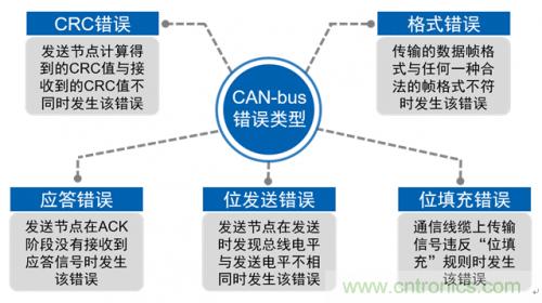 CAN-bus的可靠性很高,但是在某些情況下還是發(fā)生錯誤,為了使數(shù)據(jù)能夠在總線上可靠傳輸,CAN-bus規(guī)范對各類幀的格式、用途及發(fā)送時機(jī)都進(jìn)行了詳細(xì)的規(guī)定。下面我們來總結(jié)下在CAN通訊中會出現(xiàn)哪些錯誤。