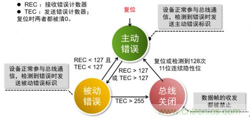 為了避免某個設(shè)備因?yàn)樽陨碓颍ɡ缬布p壞)導(dǎo)致無法正常收發(fā)數(shù)據(jù)而不斷地破壞數(shù)據(jù)幀,從而影響其他正常節(jié)點(diǎn)通訊,CAN-bus規(guī)范中規(guī)定每個CAN控制器都有一個發(fā)送錯誤計(jì)數(shù)器和一個接收計(jì)數(shù)器。根據(jù)計(jì)數(shù)值不同CAN節(jié)點(diǎn)會處于不同的設(shè)備狀態(tài),狀態(tài)之間的轉(zhuǎn)換關(guān)系見下圖: