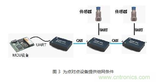 我們都知道CAN總線是一種多主總線,可以實(shí)現(xiàn)多節(jié)點(diǎn)組網(wǎng)通訊,自帶優(yōu)先級(jí)仲裁機(jī)制,可有效防止數(shù)據(jù)沖突?;谶@一優(yōu)點(diǎn),可以利用CSM100模塊為點(diǎn)對(duì)點(diǎn)通訊設(shè)備提供組網(wǎng)的條件。例如,某些串口接口的傳感器,如果我們需要把多個(gè)傳感器的數(shù)據(jù)讀到MCU而MCU的串口數(shù)量不足怎么辦呢?