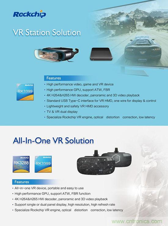 【導讀】本屆CES2017大展中VR全球產(chǎn)業(yè)熱度不減不增,全球硬件、平臺和內(nèi)容廠商蜂擁而至,Intel、NVIDIA、Qualcomm芯片商以及HTC、Oculus、SONY、三星、華為設備商均發(fā)布極具看點的新技術與旗艦機型。瑞芯微Rockchip本次展示了VR設備方案集群,方案從播放終端拓展至攝錄領域,成為VR新看點。