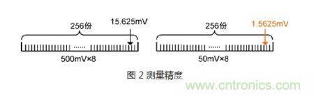 一般數(shù)字示波器采用的都是8位ADC,對任何一個波形值都是用256個0和1來重組。假設(shè)示波器垂直方向滿量程為8格,對應(yīng)量化級數(shù)256。在垂直檔位為500mV/div的情況下,垂直精度為(500mV*8)/256=15.625 mV。測量同一個信號,在垂直檔位為50mV/div的情況下,即(50mV*8)/256=1.5625 mV,垂直精度就達(dá)到了1.5625 mV。