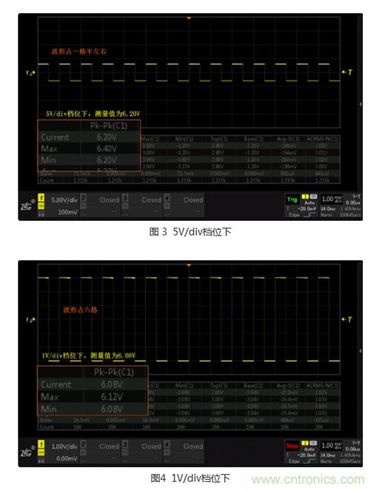 當(dāng)波形占屏幕6格時,所測的峰峰值為6.08V,相差2個分辨率,相對6V的峰峰值誤差為1.3%。