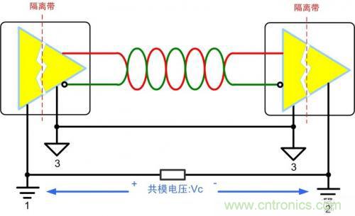 隔離收發(fā)器可將總線和控制電路進行電氣隔離,將高壓阻擋在控制系統(tǒng)之外,可以有效地保證操作人員的人身及系統(tǒng)安全。不僅如此,隔離可以抑制由接地電勢差、接地環(huán)路引起的各種共模干擾,保證總線在嚴重干擾和其它系統(tǒng)級噪聲存在的情況下不間斷、無差錯運行。如圖 1所示,使用隔離收發(fā)器后,可以有效防止形成地環(huán)路,總線參考地可跟隨共模電壓的波動而波動,共模電壓全部由隔離帶承受,共模電壓對總線信號變得不再可見,從而保證總線穩(wěn)定可靠地通信。