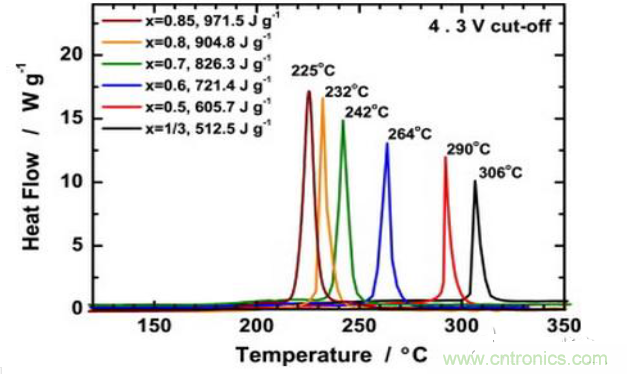 而且隨著NCM能量密度的不斷提高,材料的熱穩(wěn)定性會(huì)越來越差。下圖表述的是隨著Ni含量的升高材料的分解溫度逐漸下降。