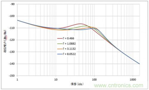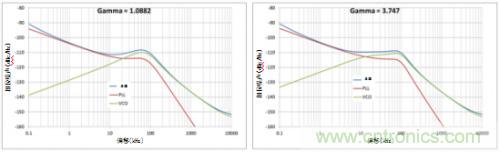 圖2所示為伽馬對相位噪聲的影響?;芈穾捄拖辔贿呄尴嗤?,而伽馬值不同。伽馬值越高,由于噪聲整形回路濾波器平緩度提升,VCO的提升斜率也會變低。