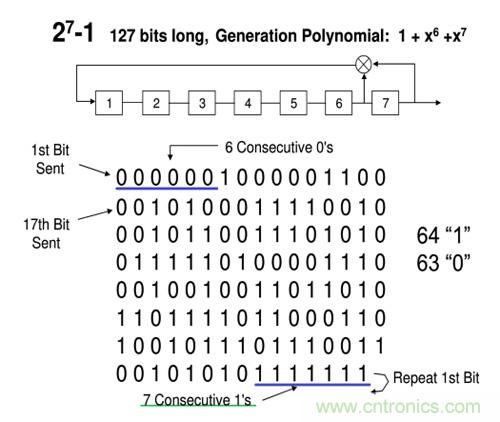 在圖一中可以看到,PRBS7最長(zhǎng)是127bit(27-1), 理論上來(lái)說(shuō),7bit的2進(jìn)制碼,一共會(huì)有27個(gè)不同組合,但是,如果碼流全部為‘0’的時(shí)候,經(jīng)過(guò)異或運(yùn)算,輸入到寄存器第一位的值還是0, 這樣移位寄存器將會(huì)一直輸出為零,移位寄存器被死鎖。所以PRBS碼流不能全部為零。另外,PRBS7 碼流中最長(zhǎng)的連續(xù)‘1’個(gè)數(shù)為7個(gè),最長(zhǎng)的連續(xù)‘0’個(gè)數(shù)為6個(gè)。127bit的連續(xù)碼流中,一共有64個(gè)‘1’,63個(gè)‘0’。