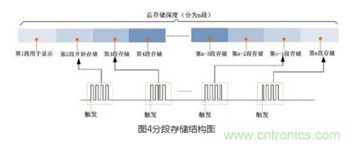 原理如下圖所示:總的存儲深度分為n段,第1段用于顯示,第2段開始存儲,也就是當(dāng)發(fā)生第一次觸發(fā)時采集的數(shù)據(jù)存儲到第2段存儲空間中,當(dāng)?shù)?段存儲空間存儲滿之后,結(jié)束第一次觸發(fā),等待第二次觸發(fā)的到來,觸發(fā)后把數(shù)據(jù)存儲到第3段存儲空間中,以此類推。