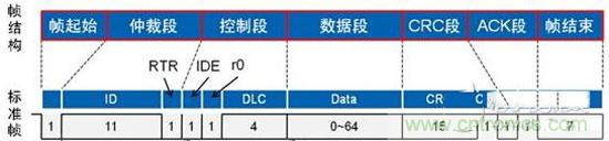 以標準數(shù)椐幀為例,從結(jié)構(gòu)上看分成7段,分別為起始段、仲裁段、控制段、數(shù)椐段、CRC校驗段、ACK應(yīng)答段、幀結(jié)束段,如圖1所示: