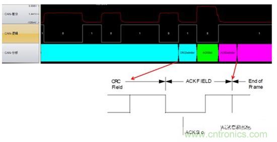 當一個接收節(jié)點接收的幀起始到CRC段之間的內(nèi)容沒發(fā)生錯誤時,它將在ACK段發(fā)送一個顯性電平。 如圖3所示: