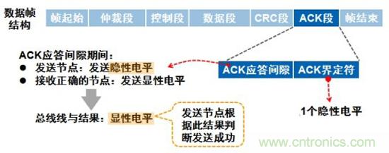 應(yīng)答間隙:所有接收到匹配CRC序列(CRC SEQUENCE)的節(jié)點會在應(yīng)答間隙(ACK SLOT)期間用一“顯性”的位寫入發(fā)送器的“隱性”位來作出回答,由于CAN總線線與的原理,只要總線上有一個節(jié)點正確接收到數(shù)據(jù),則ACK SLOT就會被填入顯性電平。