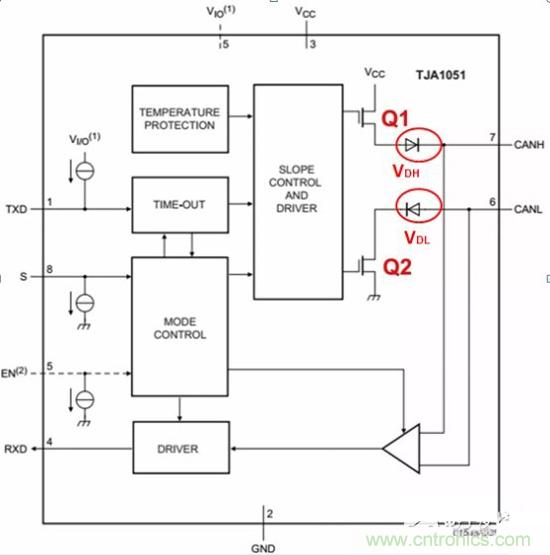 首先,我們看一款CAN收發(fā)器的典型內(nèi)部結(jié)構(gòu)圖,CANH、CANL連接總線。
