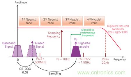 在數(shù)字化儀中,您可以考慮選擇超過采樣率(fn)一半的帶寬。有時可以通過欠采樣(undersampling)和特殊輸入濾波來捕獲大于 Fs/2 的頻率。例如,是德科技的 M9203A 和 M9703B 數(shù)字化儀支持 2 GHz 帶寬,ADC 采樣時鐘速率為 1.6 GS/s,允許使用欠采樣直接進行下變頻。
