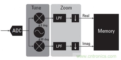 數(shù)字化儀采用諸如零抑制(zero suppress)等數(shù)據(jù)壓縮技術(shù),只保留超過給定閾值的相關(guān)信號。它們還使用數(shù)據(jù)打包和四舍五入來優(yōu)化可用存儲器空間。也使用諸如數(shù)字下變頻(DDC)等實時數(shù)據(jù)壓縮技術(shù)。DDC 直接在 ADC 數(shù)據(jù)上進行數(shù)據(jù)的頻率轉(zhuǎn)換和抽取。圖 3 中的框圖顯示了其基本原理。捕獲到復(fù)雜的 IQ 數(shù)據(jù),可以使中心頻率下變頻到 0 Hz。然后使用濾波和數(shù)據(jù)抽取來去除不需要的頻率分量,縮減所需數(shù)據(jù)的大小。在對寬帶采集中的一小段頻譜進行分析時,DDC 非常有價值。DDC 不僅可以減少所需的存儲空間,而且可以降低寬帶綜合噪聲,改善整體信噪比(SNR)。