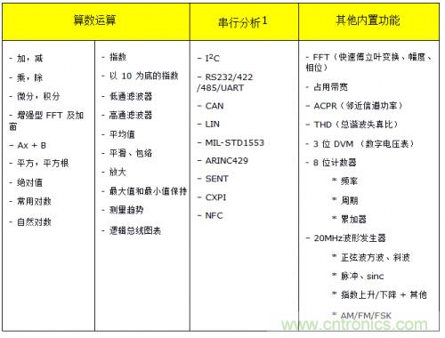 ·測量和分析。示波器針對易用性和測量速度進行了優(yōu)化。它們的硬件中內(nèi)置了各種測量和分析工具。如果是臺式示波器,用戶可以從臺式儀器的前面板訪問這些測量和工具,如果是模塊化儀器,用戶可以從軟件前面板訪問。這使得示波器非常適合用于在設(shè)計或故障診斷期間進行的各種常見測試。由于測量在硬件中執(zhí)行,因此可以快速獲取結(jié)果,縮短測試臺或 ATE 環(huán)境的測量時間。以下所示為 InfiniiVision 系列示波器中提供的一些算數(shù)運算、FFT 和串行協(xié)議分析工具。