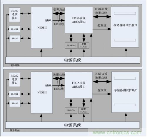 在測試NAND FLASH時,測試時間長達(dá)十個小時不等。在此為提高測試效率,增加測試速度,本設(shè)計(jì)采用兩套完全一樣且獨(dú)立的硬件系統(tǒng)構(gòu)成??赏瑫r最多測試2片NAND FLASH器件。每一個硬件系統(tǒng)由一個微處理器(NIOSII)加一個大容量FPGA及一個存儲器測試擴(kuò)展接口(即ABUS接口)三大模塊構(gòu)成。如圖3-1。RS232通信接口實(shí)現(xiàn)測試系統(tǒng)與上位機(jī)的數(shù)據(jù)交換,完成人機(jī)交互操作。電源系統(tǒng)產(chǎn)生各種合適的電壓,滿足各芯片的電源供給。