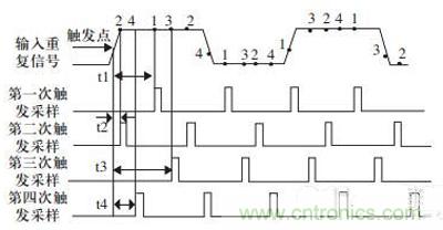 當(dāng)采樣過程不滿足Nyquist(奈奎斯特)采樣定理,就可以考慮使用另一種采集方法--等效采樣。等效采樣的基本原理是把高頻、快速信號(hào)變成低頻、慢速重復(fù)信號(hào)進(jìn)行采集。為了達(dá)到低速采樣還原高頻信號(hào)的目的,要求被測(cè)信號(hào)一定是周期變化的,如果將每個(gè)采樣點(diǎn)安排在不同信號(hào)周期內(nèi),取自波形不同的位置上,而不是在同一個(gè)周期的話,就可以大大降低采樣頻率。最后通過數(shù)學(xué)方法再將多個(gè)周期內(nèi)的采樣點(diǎn)還原到一個(gè)周期內(nèi),重構(gòu)被測(cè)信號(hào)。