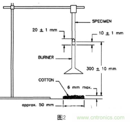 支架的材料進(jìn)行測試,樣品的尺寸為200mm×50mm,延縱向纏繞在直徑為12.7mm的棒上,樣品垂直夾持,樣品底端距燃燒器管的頂端的距離為95mm,噴燈垂直放置,對樣品施加3s的火焰,撤離火焰距試樣至少150mm的距離,以免影響試樣的續(xù)燃,等到試樣停止燃燒,立即再對試樣施加3s的火焰。如果在每次施加火焰過程中,樣品有掉下溶化物或燃燒物,則燃燒器要傾斜到45度,且在施加火焰的過程中,燃燒器在樣品未重疊區(qū)域稍微移動一些,以免滴落物滴進(jìn)噴管。