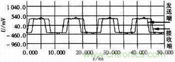 在實際的PCB布線時,如果由于產(chǎn)品結構的需要,不能縮短信號線長度時,應采用差分信號傳輸。差分信號有很強的抗共模干擾能力,能大大延長傳輸距離。差分信號有很多種,如ECL、PECL、LVDS等,表1列出LVDS相對于ECL、PECL系統(tǒng)的主要特點。LVDS的恒流源模式低擺幅輸出使得LVDS能高速驅(qū)動,對于點到的連接,傳輸速率可達800Mbps,同時LVDS低噪聲、低功耗,連接方便,實際中使用較多。LVDS的驅(qū)動器由一個通常為3.5mA的恒流源驅(qū)動對差分信號線組成。接收端有一個高的直流輸入阻抗,幾科全部的驅(qū)動電流流經(jīng)10Ω的終端電阻,在接收器輸入端產(chǎn)生約350mV電壓。當驅(qū)動狀態(tài)反轉(zhuǎn)時,流經(jīng)電阻的電流方向改變,此時在接收端產(chǎn)生有效的邏輯狀態(tài)。圖5是利用LVDS芯片DS90LV031、DS90LV032把信號轉(zhuǎn)換成差分信號,進行長距離傳輸?shù)牟ㄐ螆D。在仿真時設置仿真頻率為66MHz理想方波,傳輸距離為508mm,差分對終端接100Ω負載匹配傳輸線的差分阻抗。從仿真結果看,LVDS接收端的波形除了有延遲外,波形保持完好。