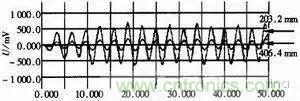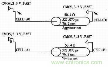 由于頻率的提高,傳輸線之間的串擾明顯增大,對信號完整性也有很大的影響,可以通過仿真來預測、模擬,并采取措施加以改善。以CMOS信號為例建立仿真模型,如圖6所示。在仿真時設置干擾信號的頻率為66MHz的方波,被干擾者設置為零電平輸入,通過調(diào)整兩根線的間距和兩線之間平行走線的長度來觀察被干擾者接收端的波形。仿真結果如圖7,分別為間距是203.2mm、406。4mm時的波形。