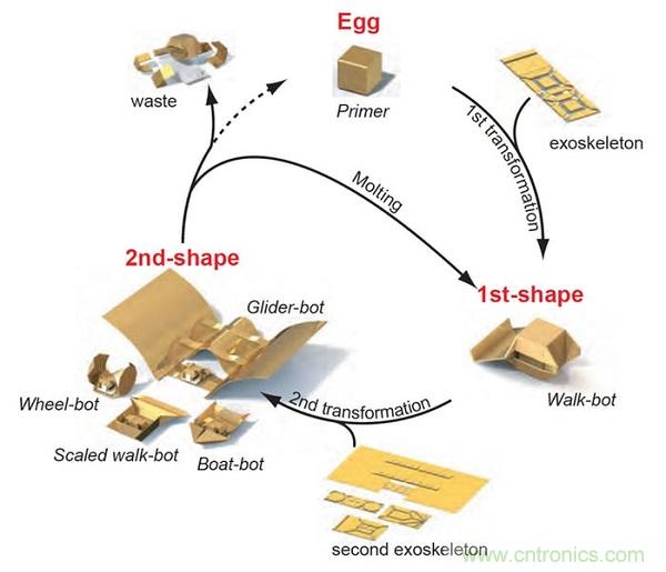 盡管目前已經(jīng)成功打造出能夠改變外形或功能的大型機器人,但要建構(gòu)能自行重新配置的小型機器人仍十分困難,部份原因在于機載電子組件的尺寸和重量限制。立方形的Primer機器人可以透過磁鐵遠程控制,而其以熱啟動的外骨骼或「皮膚」則是長方形的塑料片,可以自行折迭成不同的形狀,以便為各種不同的任務(wù)客制機器人。而當(dāng)Primer完成工作后,則浸入水中溶解掉外骨骼。