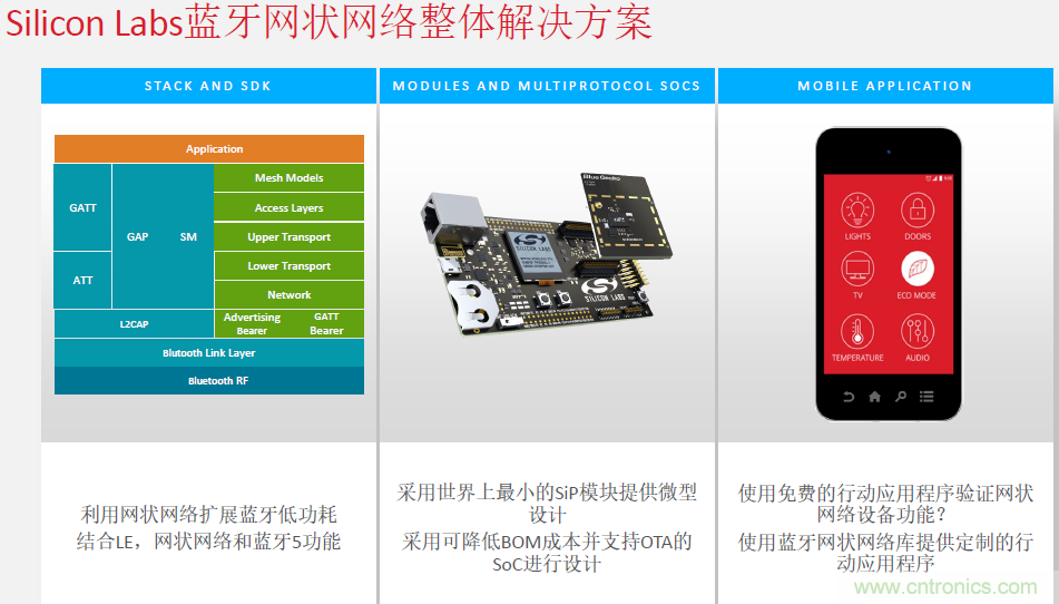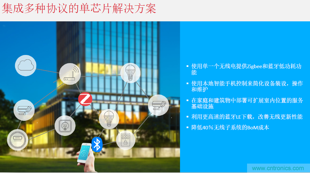 陳雄基以藍(lán)牙5的Mesh網(wǎng)絡(luò)和智能家居,尤其是智能照明中常用的ZigBee網(wǎng)絡(luò)為例,作了詳細(xì)的說明。就在一個(gè)多月前 Silicon Labs 為其Wireless Gecko片上系統(tǒng)(SoC)和模塊產(chǎn)品組合發(fā)布了新的動(dòng)態(tài)多協(xié)議軟件,可同時(shí)在單一SoC上運(yùn)行zigbee和低功耗藍(lán)牙(Bluetooth low energy),匯集了這兩種協(xié)議的關(guān)鍵應(yīng)用優(yōu)勢(shì)。這種多協(xié)議解決方案可實(shí)現(xiàn)物聯(lián)網(wǎng)(IoT)應(yīng)用的高級(jí)功能,且不會(huì)帶來雙芯片架構(gòu)的額外復(fù)雜性和硬件成本,從而將無線子系統(tǒng)物料清單(BOM)成本和尺寸降低達(dá)40%。