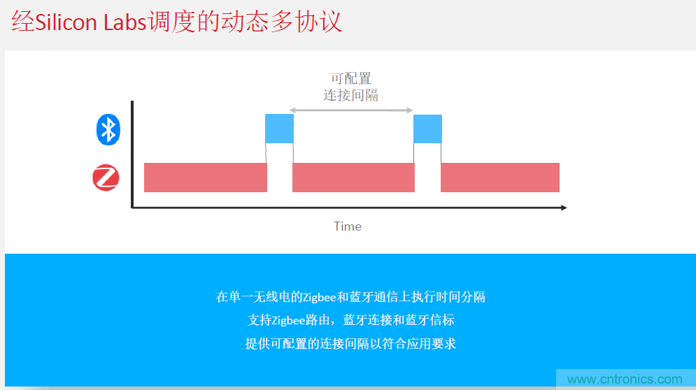 Silicon Labs在芯片設(shè)計(jì)時(shí),就提出了動(dòng)態(tài)多協(xié)議的做法。即:在單一無線電的Zigbee和藍(lán)牙通信上執(zhí)行時(shí)間分隔,支持Zigbee路由、藍(lán)牙連接和藍(lán)牙信標(biāo)。為工程師提供可配置的連接間隔,以符合應(yīng)用要求。陳雄基表示,目前這種做法據(jù)他所知Silicon Labs是業(yè)界唯一已經(jīng)在技術(shù)上實(shí)現(xiàn)的公司。