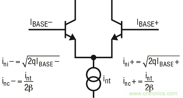 就寬帶噪聲而論,兩個輸入晶體管均具有與其基極相關聯(lián)的點噪聲 (ini- 和 ini+),這些點噪聲是不相干的。來自位于輸入對尾部之電流源的噪聲 (int) 還產(chǎn)生了在兩個輸入之間劃分的相干噪聲 (在每個輸入中為 int/2β)。如果兩個輸入上承載的電阻相等,則每個輸入上的相干電壓噪聲也是相等的,并且抵消 (根據(jù)放大器的共模抑制能力),因而留下的主要是不相干噪聲。這在產(chǎn)品手冊中被列為平衡電流噪聲。如果兩個輸入上的電阻極大地失配,則相干和不相干噪聲分量保留,而且電壓噪聲以平方根之和相加。這在有些產(chǎn)品手冊中列為不平衡噪聲電流。