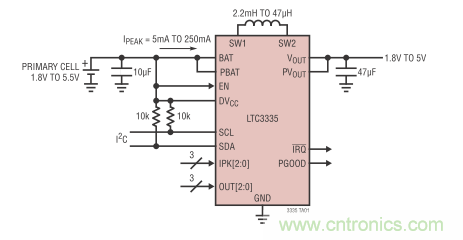 LTC3335 是一款毫微功率高效率同步降壓-升壓型轉(zhuǎn)換器,內(nèi)置了精確的庫(kù)倫計(jì)數(shù)器,提供高達(dá) 50mA 連續(xù)輸出電流。該器件具僅為 680nA 的靜態(tài)電流,可編程峰值輸入電流從低至 5mA 直至 250mA,非常適合多種低功率電池應(yīng)用,例如在可穿戴設(shè)備和 IoT 設(shè)備中見(jiàn)到的那些應(yīng)用。其 1.8V 至 5.5V 輸入電壓范圍和 8 個(gè) 1.8V 至 5V 的用戶(hù)可選輸出允許在輸入電壓高于、低于或等于輸出電壓時(shí),提供穩(wěn)定的輸出電源。此外,該器件集成的精確 (±5% 電池放電測(cè)量準(zhǔn)確度) 庫(kù)倫計(jì)數(shù)器可在長(zhǎng)壽命不可再充電的電池供電應(yīng)用中,對(duì)累積電池放電提供準(zhǔn)確監(jiān)視,這類(lèi)應(yīng)用在很多情況下具極其平坦的電池放電曲線。典型應(yīng)用包括無(wú)線傳感器、遠(yuǎn)程監(jiān)視器和ADI的 Dust Networks SmartMesh系統(tǒng)。LTC3335 包含 4 個(gè)內(nèi)部低 RDSON MOSFET,可提供高達(dá) 90% 的效率。其他特點(diǎn)包括一個(gè)可編程放電報(bào)警門(mén)限、一個(gè)用于存取庫(kù)倫計(jì)數(shù)值和器件設(shè)定的 I2C 接口、一個(gè)電源良好輸出和 8 個(gè) 5mA 至 250mA 的可選峰值輸入電流以適合多種類(lèi)型和尺寸的電池。采用耐熱增強(qiáng)型 20 引線 3mm x 4mm QFN 封裝的 LTC3335 的工作結(jié)溫范圍為 -40°C 至 +125°C。圖 2 顯示了 LTC3335 的典型應(yīng)用電路。