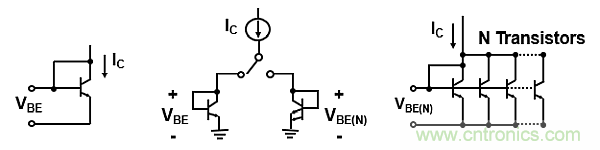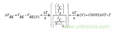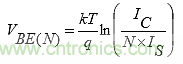 公式(2)顯示了許多并聯晶體管的基極-發(fā)射極的VBE(N)值。