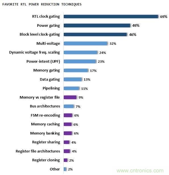 除了上述這些方法,高效的低功耗技術(shù)還有許多,比如襯底反偏(加反向電壓降低襯底漏電),多閾值單元(Multi-Vth cell)等等設(shè)計方法。下圖是一些比較熱門的RTL級低功耗技術(shù)。
