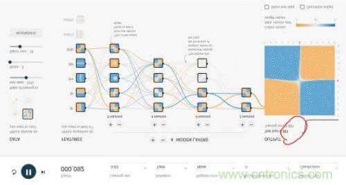 整個網(wǎng)絡(luò)的輸入層是FEATURES(待解決問題的特征),例如x1和x2表示垂直或者水平切分來劃分藍(lán)色與黃色點,這是最容易理解的2種劃分點的方法。其余5種其實不太容易想到,這也是傳統(tǒng)的專家系統(tǒng)才需要的,實際上,這個游樂場就是為了演示,1、好的神經(jīng)網(wǎng)絡(luò)只用最基本的x1,x2這樣的輸入層FEATURES就可以完美的實現(xiàn);2、即使有很多種輸入特征,我們其實并不清楚誰的權(quán)重最高,但好的神經(jīng)網(wǎng)絡(luò)會解決掉這個問題。