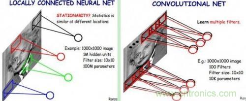 CNN中認(rèn)為同一層中的權(quán)重參數(shù)可以共享,因為同一張圖片的各個不同區(qū)域具有一定的相似性。這樣原本的全連接計算量過大問題就解決了,如下圖所示: