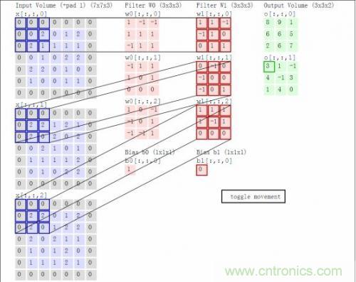 這里卷積核大小與移動的步長stride、輸出深度決定了下一層網(wǎng)絡(luò)的大小。同時,核大小與stride步長在導(dǎo)致上一層矩陣不夠大時,需要用padding來補(bǔ)0(如上圖灰色的0)。以上就叫做卷積運算,這樣的一層神經(jīng)元稱為卷積層。上圖中W0和W1表示深度為2。