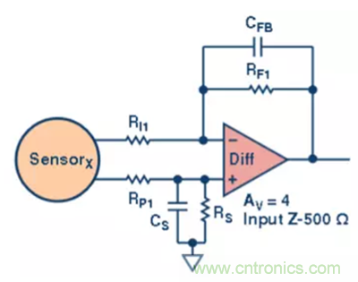 第一級,一個(gè)簡單的差分放大器 (圖2)。該放大器的增益為 4×,輸入阻抗為 500 Ω。設(shè)置電容是為了進(jìn)行可選的濾波處理。