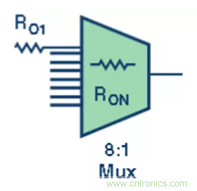 第二級,將放大器的輸出信號施加到多路復(fù)用器的 8 個(gè)輸入端 (圖3)。每個(gè)輸入以一個(gè)阻尼電阻 (RO) 進(jìn)行緩沖,以減少多路復(fù)用器通道切換導(dǎo)致的電荷反沖。根據(jù)多路復(fù)用器數(shù)據(jù)手冊規(guī)定的技術(shù)規(guī)格,每個(gè)通道的內(nèi)部會設(shè)有一些寄生電容或額定 RO。