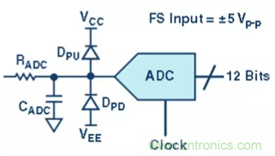 第四級,將經(jīng)過緩沖的信號施加到 12 位、1 MSPS ADC,在此,信號最終進(jìn) 入數(shù)字域 (圖5)。使用串行電阻是為了緩沖或抑制放大器與轉(zhuǎn)換器之間的信號,加大這兩個(gè)器件之間的電阻。結(jié)果會減少從轉(zhuǎn)換器反沖到放大器的電荷,非常像多路復(fù)用器。這也有助于放大器輸出建立,并防止其發(fā)生振蕩。