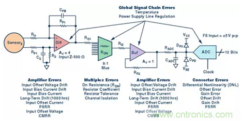 【導(dǎo)讀】整個(gè)信號鏈累積起來并且最終會影響到轉(zhuǎn)換器的誤差有多重。但請記住,轉(zhuǎn)換器是信號鏈的瓶頸,最終決定著信號的表示精度。因此,轉(zhuǎn)換器的選擇是設(shè)定系統(tǒng)整體要求的關(guān)鍵。在信號鏈中,可能會累積的誤差有兩類——即直流和交流誤差。直流或靜態(tài)誤差(如增益和失調(diào)誤差)有助于了解信號鏈的精度或靈敏度;交流類誤差也稱為噪聲和失真,限制著系統(tǒng)的性 能和動態(tài)范圍。