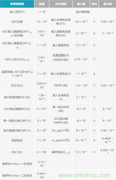 花些時(shí)間編制一份電子表格,使其布局合理、有序。在表格頂部,定義全局誤差和信號鏈規(guī)格,因?yàn)檫@些數(shù)據(jù)會影響整個(gè)信號鏈的性能。放大器規(guī)格/誤差也放在頂部,因?yàn)檎麄€(gè)信號鏈中有多種誤差和兩個(gè)放大器級。