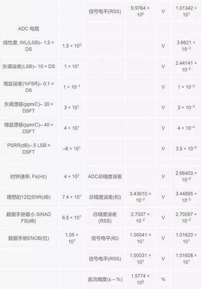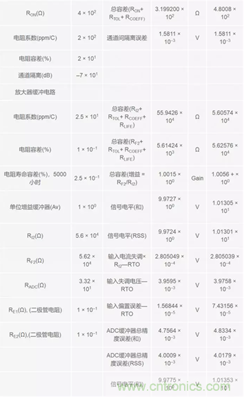 在計(jì)算結(jié)果,所有誤差均已轉(zhuǎn)換成電壓格式。這樣是為了方便起見,因?yàn)檗D(zhuǎn)換器處于信號鏈末端,其輸入滿量程是以電壓進(jìn)行描述的。RTO (參考輸出)用于描述從一級到下一級連續(xù)累計(jì)的 誤差。各級同時(shí)還產(chǎn)生一個(gè)獨(dú)立的合計(jì)數(shù)和RSS (和方根)合計(jì)數(shù),以展示根據(jù)所用方法的不同,誤差是如何累積起來的。