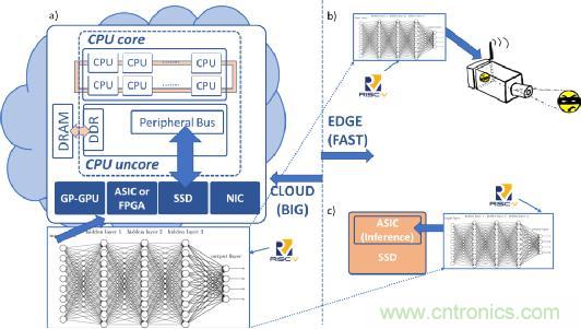 在圖1a中,云數(shù)據(jù)中心服務(wù)器利用在大型大數(shù)據(jù)集上訓(xùn)練的深度學(xué)習(xí)神經(jīng)網(wǎng)絡(luò)來(lái)執(zhí)行機(jī)器學(xué)習(xí)的功能。在圖1b中,邊緣設(shè)備中的安全攝像機(jī)采用經(jīng)過(guò)大數(shù)據(jù)訓(xùn)練的推理引擎來(lái)實(shí)時(shí)識(shí)別圖像(快速數(shù)據(jù))。在圖1c中,智能固態(tài)硬盤設(shè)備采用推理引擎進(jìn)行數(shù)據(jù)識(shí)別和分類,從而有效地利用了此設(shè)備的帶寬。圖1展示了RISC-V內(nèi)核的潛在機(jī)會(huì),它可以自由地添加專有的及未來(lái)標(biāo)準(zhǔn)化的矢量指令,這些指令對(duì)于處理深度學(xué)習(xí)和推理技術(shù)相當(dāng)有效。
