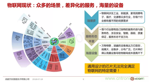 天軟信息在NB-IoT這個(gè)產(chǎn)業(yè)鏈上扮演的角色是要打造一個(gè)端到端的運(yùn)營方案,從芯片到運(yùn)營整體,黃總指出,通用設(shè)計(jì)的芯片無法滿足物聯(lián)網(wǎng)的特定需要,物聯(lián)網(wǎng)是一個(gè)海量兼容的設(shè)備,不同領(lǐng)域的設(shè)備有著完全不一樣的形態(tài)要求,所以提出了一個(gè)觀念叫做服務(wù)定義芯片。傳統(tǒng)的芯片設(shè)計(jì)行業(yè),芯片設(shè)計(jì)商定義一個(gè)芯片是根據(jù)市場需求和發(fā)展趨勢來定義這個(gè)芯片的規(guī)格,然后交由芯片制造商去做具體的制造的工藝設(shè)計(jì)規(guī)劃,而現(xiàn)在的模式是把設(shè)計(jì)服務(wù)這塊獨(dú)立出來,也就是說真正了解市場,接觸這個(gè)市場對這個(gè)行業(yè)發(fā)展把握非常精準(zhǔn)的一些公司,他們會(huì)提出來定義具體的一款芯片需求,定義出來的芯片交到以前的芯片設(shè)計(jì)公司來完成設(shè)計(jì)的服務(wù),芯片制造商來完成這個(gè)芯片的制造,天軟信息現(xiàn)在正在走的就是這樣的模式。