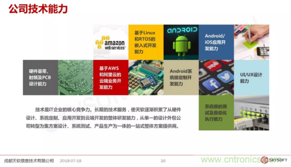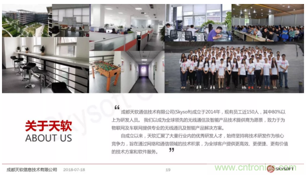 天軟信息成立于2014年,現(xiàn)有員工近150人,其中80%為研發(fā)人員。公司以成為全球領(lǐng)先的無線通信及智能產(chǎn)品技術(shù)提供商為愿景,致力于為物聯(lián)網(wǎng)及車聯(lián)網(wǎng)提供專業(yè)的無線通訊及智能產(chǎn)品解決方案。Skysoft是西部為數(shù)不多的擁有獨(dú)立綜合通信測試實(shí)驗(yàn)室,并能提供LTE終端產(chǎn)品/模塊、無線路由器、車載通信及多媒體等軟硬件研發(fā)能力的高新技術(shù)企業(yè)。